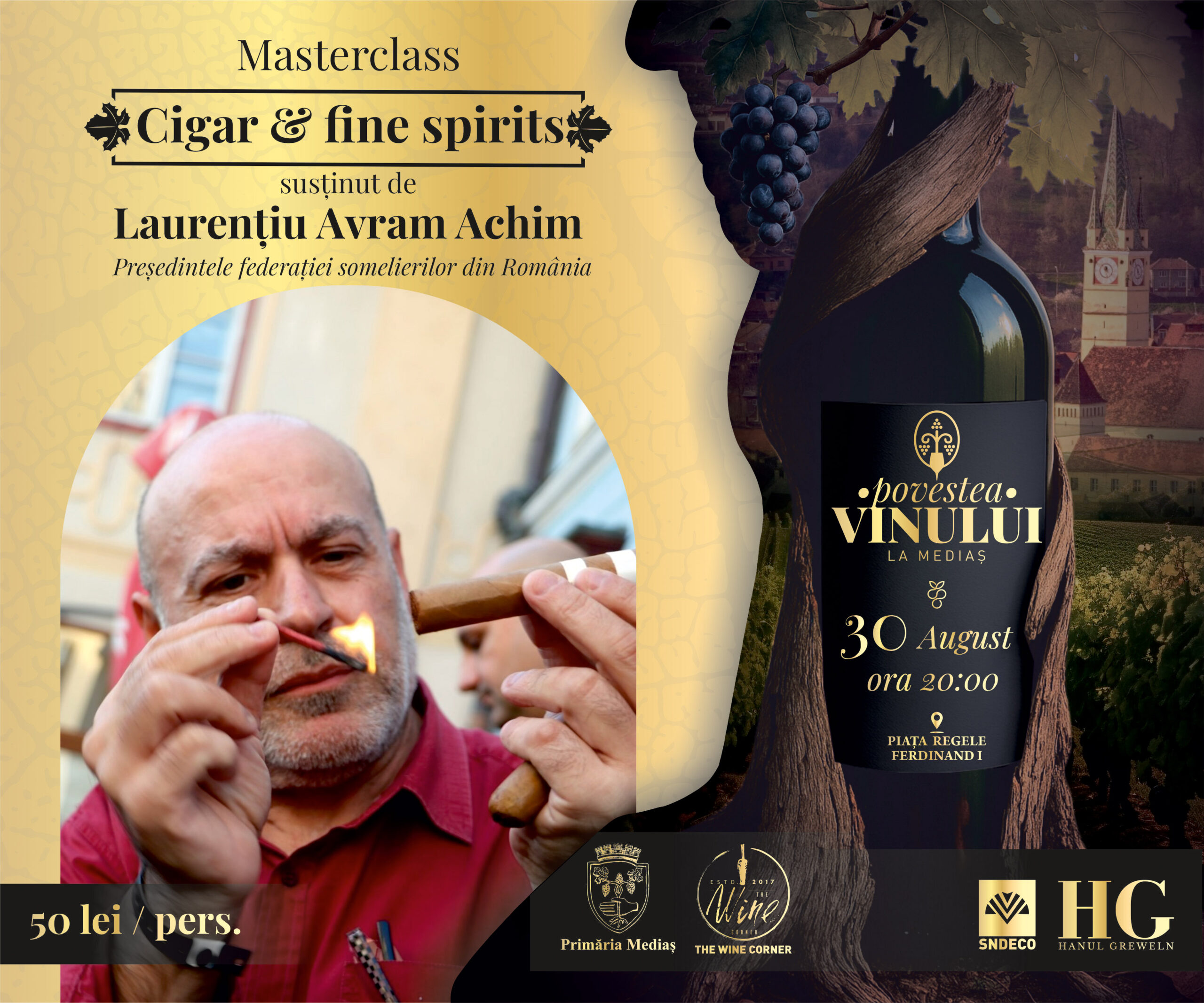 Pe 30 august, de la ora 20:00, în Piața Regele Ferdinand I din Mediaș, intrăm în lumea rafinată a trabucurilor premium și a băuturilor fine, alături de Laurențiu Avram Achim, Președintele Federației Somelierilor din România.